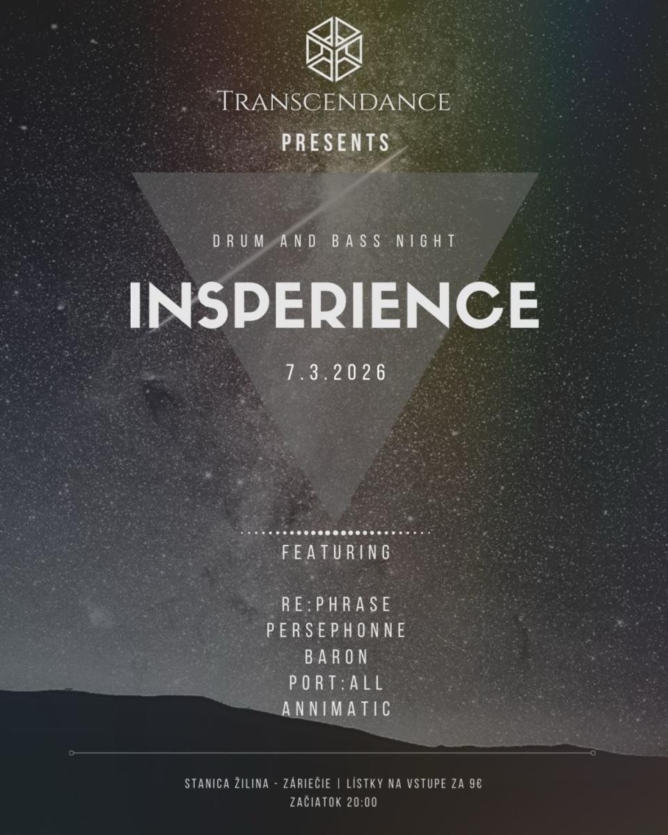 Transcendance sa vracia s novou akciou INSPERIENCE, ktorá bude tentokrát čisto drum and bassová. Večer sa bude začínať soulful a deepovou selekciou a končiť neurofunkom. Medzi vystupujúcimi tentokrát privítame 2 nové mená :