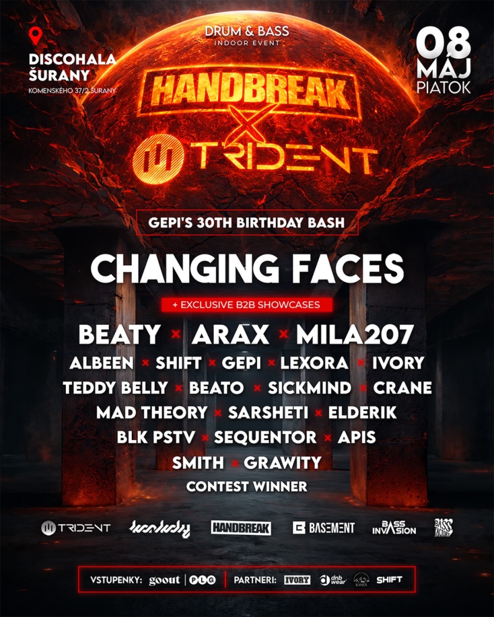 Handbreak a Trident prinášajú do Šurian indoor halový event s masívnym line-upom, ktorý posúva hranice lokálnych akcií. Ako special guest sa predstaví Changing Faces a okrem neho sa návštevníci môžu tešiť na exkluzívne b2b showcasy až šiestich slovenských dnb crews – Trident, Handbreak, Konkoly, Bass Factory, Basement a Bass Invasion.